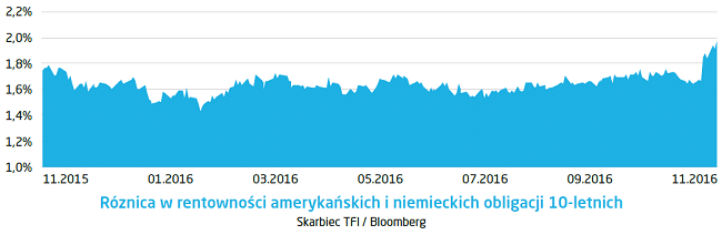 Wbrew temu, co można znaleźć w niektórych komentarzach, to co obserwujemy obecnie na rynkach jest uzasadnionym wynikiem wyborów. W szczególności można powiedzieć to na temat kursu walutowego. Ekspansja fiskalna, czy to poprzez cięcia podatków, czy to poprzez inwestycje infrastrukturalne przy inflacji bazowej (bez energii i żywności) na poziomie 2,1% r/r to dla Fed dzwonek alarmowy, że czas kolejnych podwyżek stóp właśnie się zbliża i, to jest chyba nowość, mogą mieć one większą skalę niż do tej pory przypuszczano. Wieszczący osłabienie zapomnieli, prognozując osłabienie USD, że rynek walutowy raczej kieruje się różnicą w stopach procentowych niż sympatiami wobec polityków. Zresztą, w kraju takim jak Stany Zjednoczone, szkodzenie gospodarce przez nierozsądnych polityków nie osiągnie takiej skali jak na przykład w krajach Nowej Europy, a to z uwagi na siłę instytucji demokratycznych.